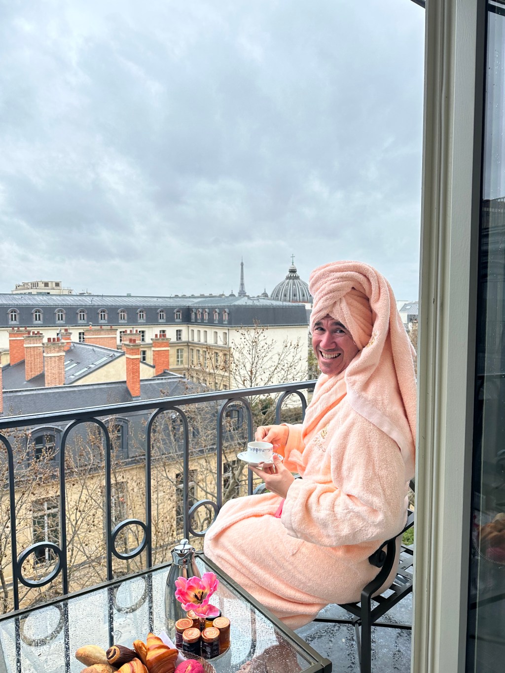 Again, sometimes all an 18-year old girl needs is to see her dad in a pink bathrobe. Sipping an early-morning coffee. Eating a raspberry filled pastry that surprised you with fruity goodness when you bit into it. Looking out to the city with the top of the Eiffel Tower peaking between the buildings.